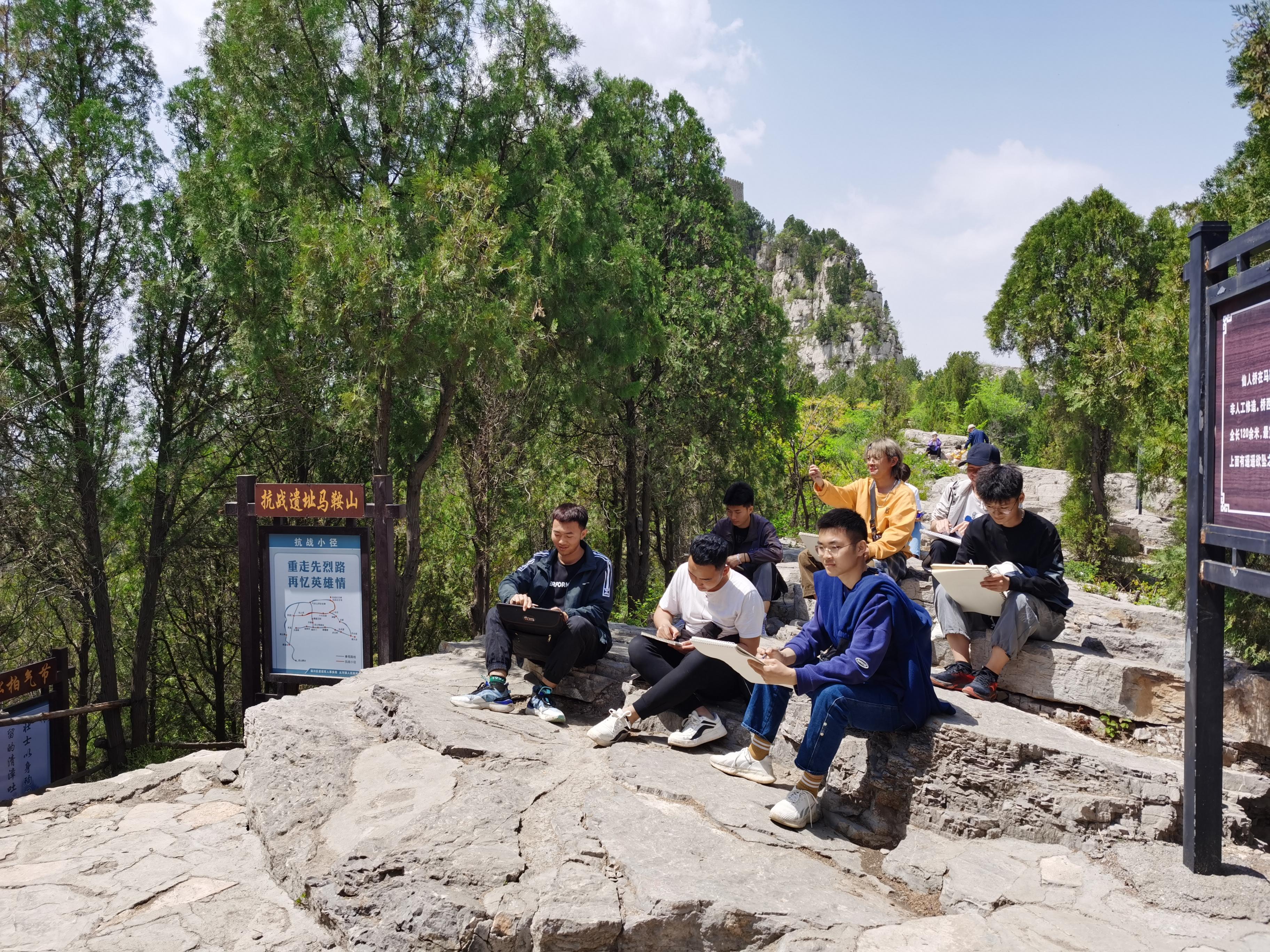 马鞍山位于淄川区太河镇的淄河片区,因其形似马鞍而得名,主峰海拔618米,总面积25.6平方公里,是集历史文化、革命传统教育和自然风光于一体的爱国主义教育基地。伴随着山区音响播放的一首首抗日革命的歌曲,师生徒步从山脚下,探寻革命先驱的足迹,先后参观了马鞍山遗留的抗战掩体、抗战指挥所、英雄石碑、齐长城齐兵营等历史文物以及抗战纪念馆、纪念堂,在描绘主题创作的同时,同学们感受到了革命先驱的伟大,接受了红色文化的洗礼。