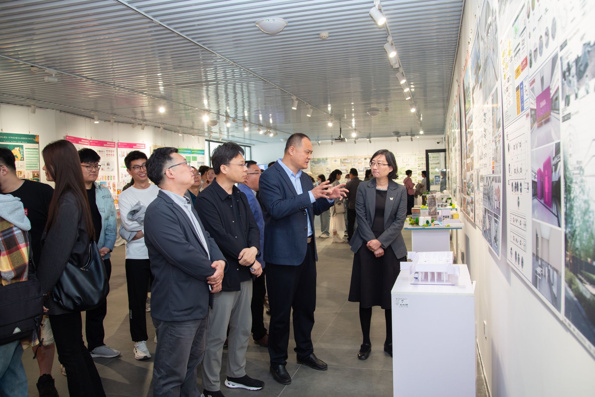 开幕式上,张庆国宣布展览开幕。仲倩致辞中对学院在研究生教育方面取得的成绩给予了肯定,高度认可参展研究生的艺术才华。杨海波致辞中全面回顾了学院研究生教育的办学历程及取得的成绩,希望师生再接再厉,共同提高研究生培养质量。研究生导师代表张中波高度赞扬了参展作品的质量,希望研究生永葆对艺术的热爱与初心。研究生代表刘淼蕊发言感谢了学校、学院老师的教育指导,并承诺将以实际行动回馈老师们的教育培养。开幕式结束后,张庆国与师生一同参观展览,全程与大家深入交流。在驻足细观作品时,与师生亲切探讨创作思路,向老师们的辛勤指导与无私付出致以诚挚谢意,对同学们的艺术构思和表现手法给予高度肯定,称赞作品兼具思想性与艺术性。现场气氛热烈,师生备受鼓舞。