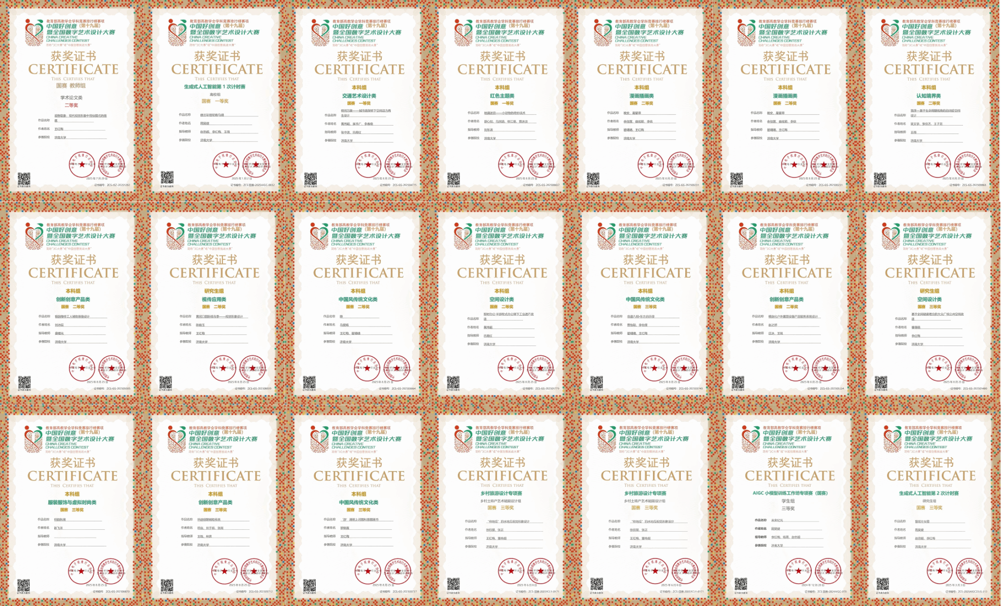 大赛设立社会创新、漫画插画、认知境界、空间设计、中国风传统文化等多个赛道,全面考察参赛者的创意水平与设计表达能力。学生组中,由张中波、吕晨红老师指导,黄玮超、崔本广、李春晓完成的作品《桥间万象——城市高架桥下空间活力再生设计》获交通艺术设计类全国一等奖;由刘东涛老师指导,邵心如、马润涵、修江珊、贾冰洁完成的作品《地道迷宫——小动物的奇妙战术》获红色主题类全国一等奖;由赵忠超、李红梅、王薇老师指导,周昊健完成的《唐三彩骆驼载马俑》获生成式人工智能第1次计时赛高校组全国一等奖。另有《茧序—基于生命周期视角的自闭症空间设计》、《即时办公·半游牧式办公潮下工业遗产改造》等7项作品获全国二等奖;《基于全民健康理念的大众广场公共空间改造》、《非遗八相•东方启示录》等8项作品获全国三等奖。教师组中,王红梅老师的学术论文《观物取象:现代视觉形象中民俗图式的意蕴》获全国二等奖,《压油沟田园综合体视觉形象设计》、《倾听你的声音》两项作品荣获全国三等奖。此外,吕晨红老师荣获本届大赛特殊贡献奖,王红梅、翟晴晴、李红梅、王薇等11位教师获国赛优秀指导教师奖。